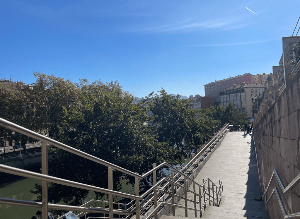 I made it to Indauxu where Fran’s school- Colegio Nra Sra del Carmen- is. Dropped the clothes in a small Farmacia bag with her name on it. I got back on the metro to Casco and rode back over to school. None of these places are very far apart but with the hills it can take a while to bike everywhere. Sometimes when the city is quiet during siesta it’s amazing to bike around- it’s like I own the streets! Anyway, I got back to school at 1pm for the last 30 minutes of class but I had missed eating my lunch. It was a such a beautiful \/ day and I was so hungry so I went to eat at my usual lunch spot- a flight of stairs down to la ria. Here’s what my lunch view looks like: